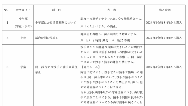 全軟連は、2027年から学童の大会において、同一試合での投手と捕手の兼任を禁止することとしました。この他にも更少年部・学童部において2026年から適用される変更がありますので、以下をご確認ください。2026発刊文書13号.pdfダウンロード...