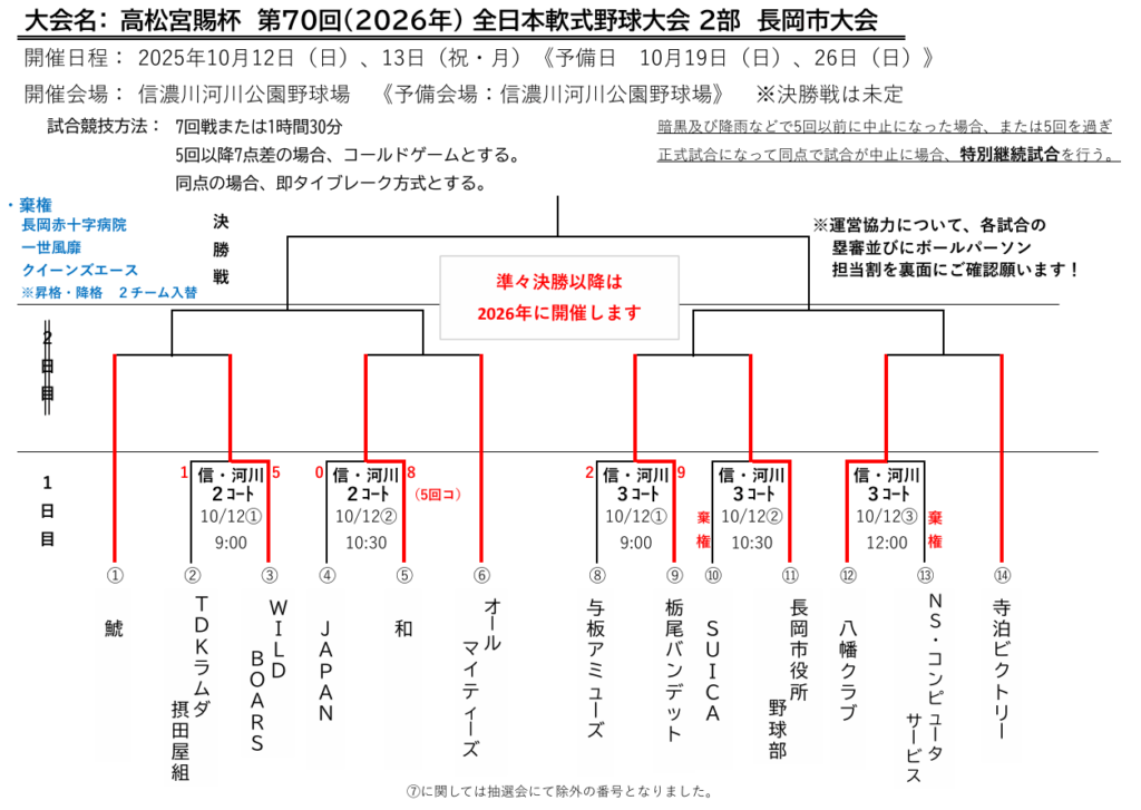 来年度大会にあたる、令和8年度 高松宮賜杯 第70回全日本軟式野球大会 2部 長岡市大会の1日目結果です。