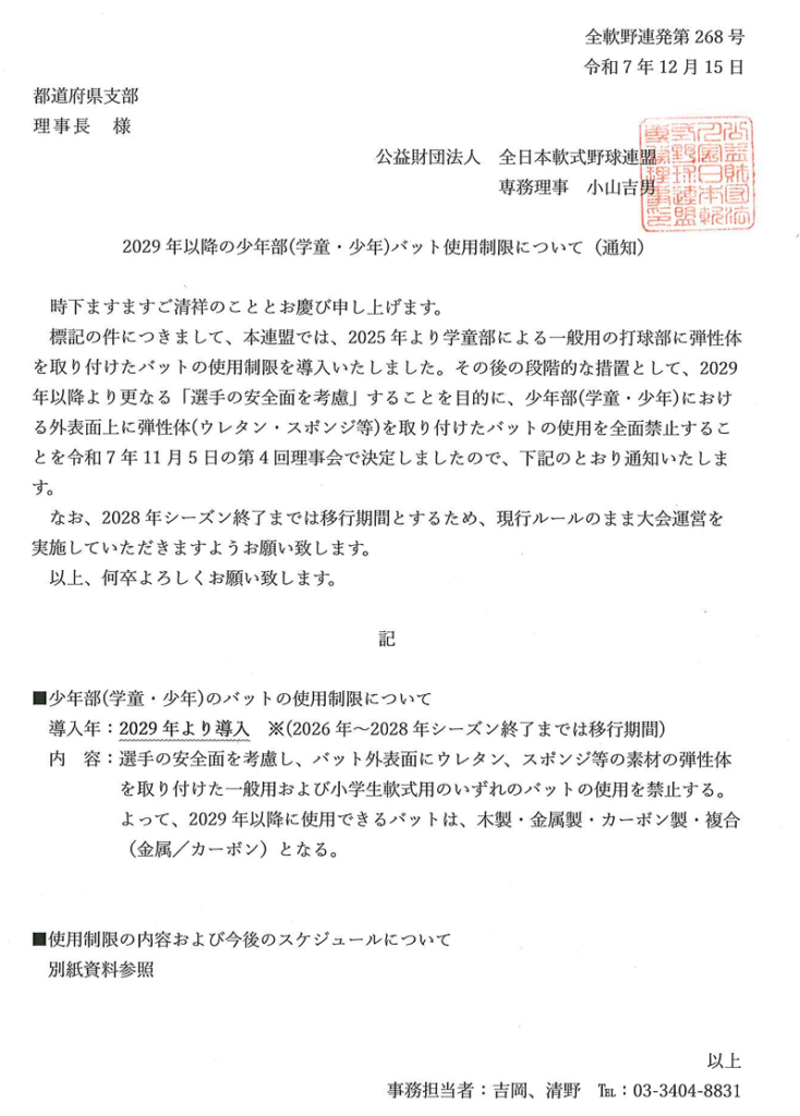 全軟連は、2029年から弾性体(ウレタン・スポンジ等)を取り付けたバット使用の全面禁止とすることを決定しました。以下、通知文書になりますので、ご確認ください。