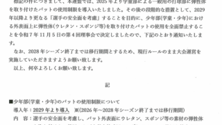 全軟連からのお知らせミズノ社より「ビヨンドマックスレガシーウッド」という木製とウレタン素材のバットを「木製バット」の取り扱いとして販売されましたが、公認申請がされておらず、JSBBマークも入っていないことから、全日本軟式野球連盟の関係大会での使用は不可となりました。